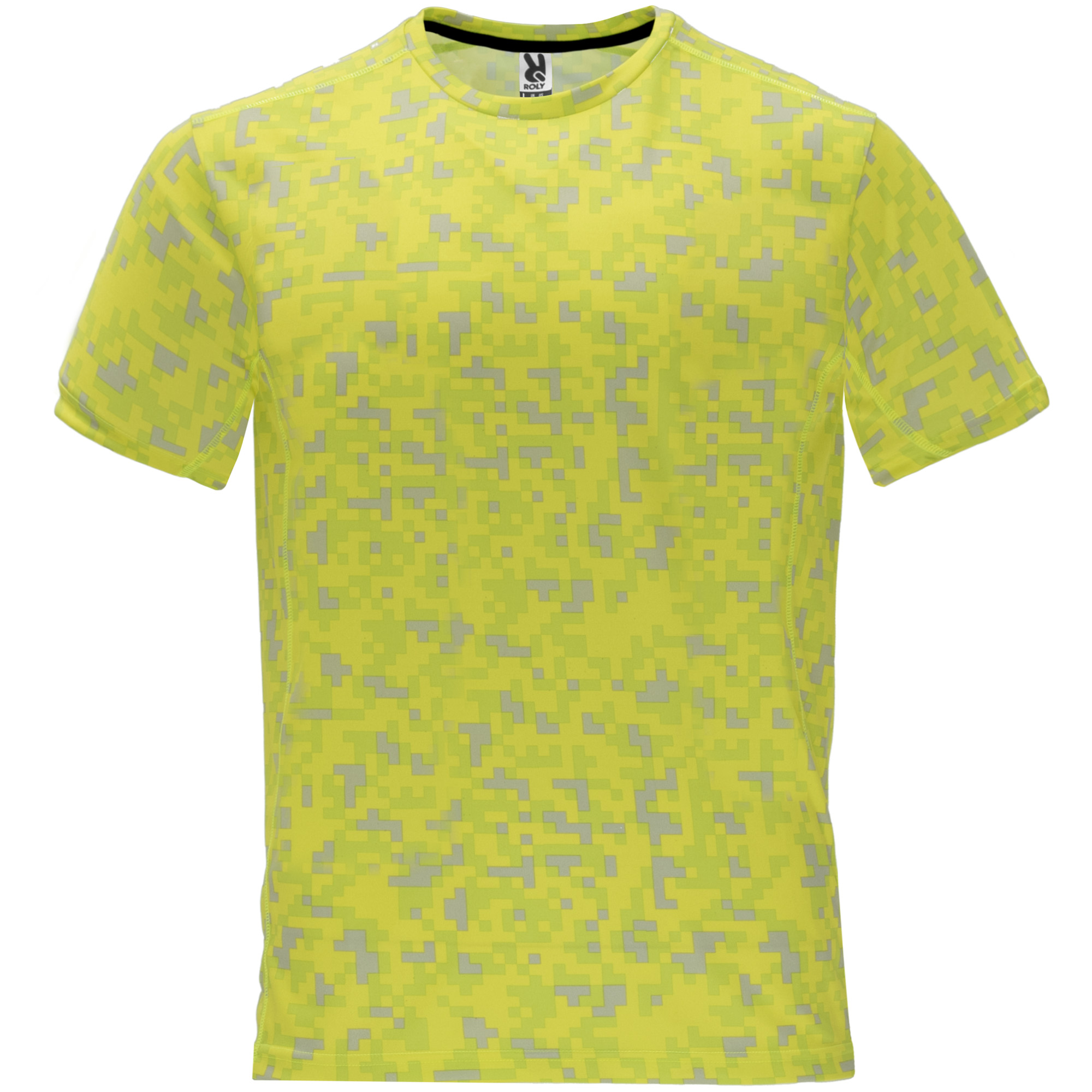Camiseta técnica de manga corta estampada. Cuello redondo con cubre costuras de refuerzo a contraste en color amarillo flúor. Paneles laterales en interior de manga y en los hombros con remallado a tono. Tejido suave, ligero y transpirable, fácil secado.