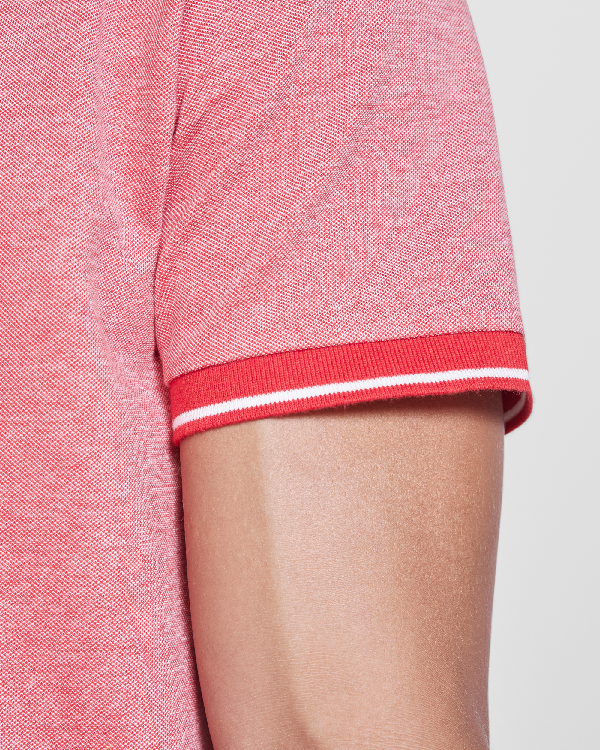 Polo Vigoré de manga corta. Cuello y bocamangas en color solido con canalé 1×1 y detalle decorativo a contraste. Tapeta interior con cinta decorativa a contraste y tres botones. Bajo con apertura lateral reforzada y cinta decorativa. Espalda ligeramente más larga que el delantero.