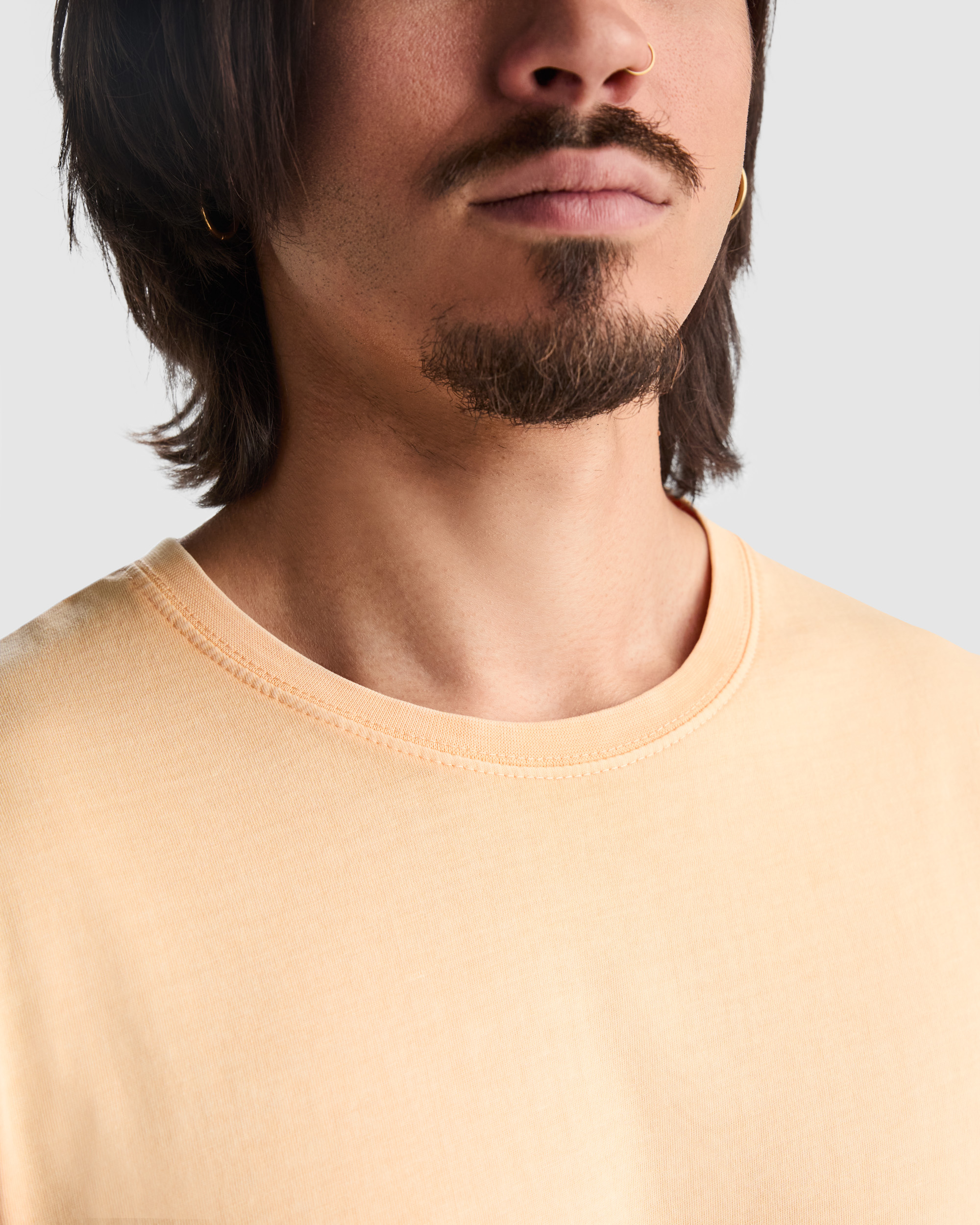 Camiseta man de manga corta en algodón peinado efecto lavado. Cuello redondo en canalé 1×1. Cubrecosturas en cuello del mismo tejido. Costuras dobles en laterales y sisas.