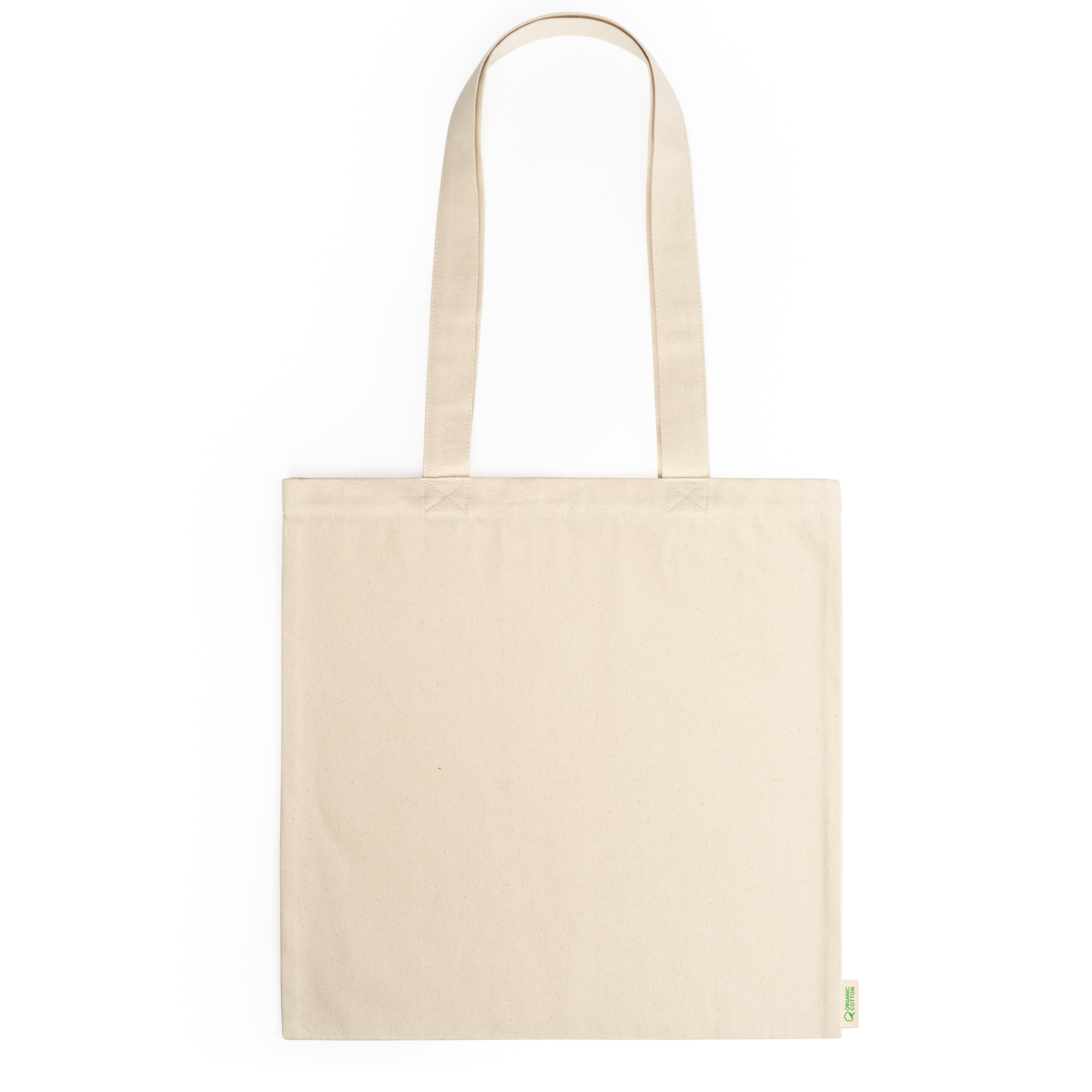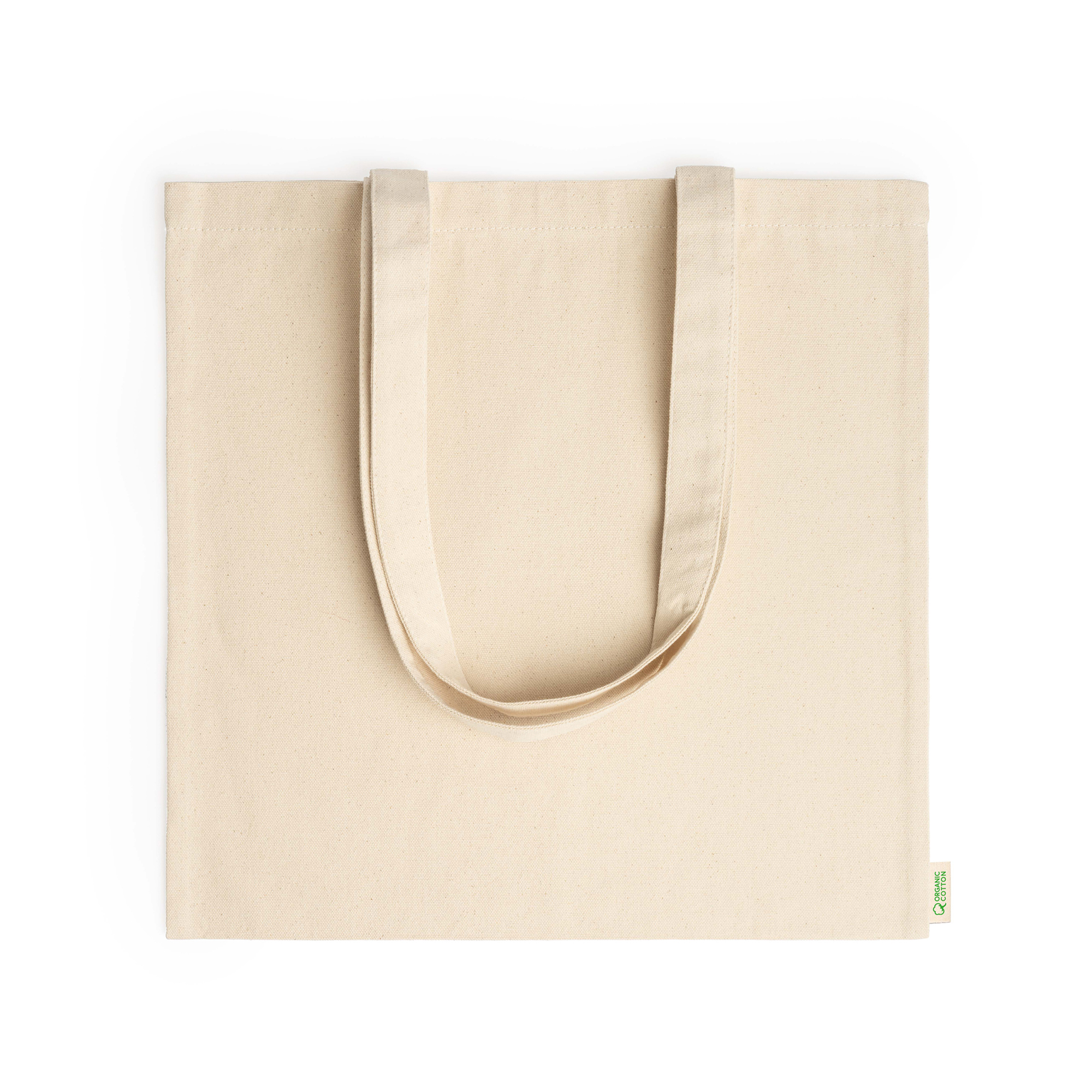 Bolsa 100% algodón orgánico de 300 g/m² con prácticas asas largas de 70cm.