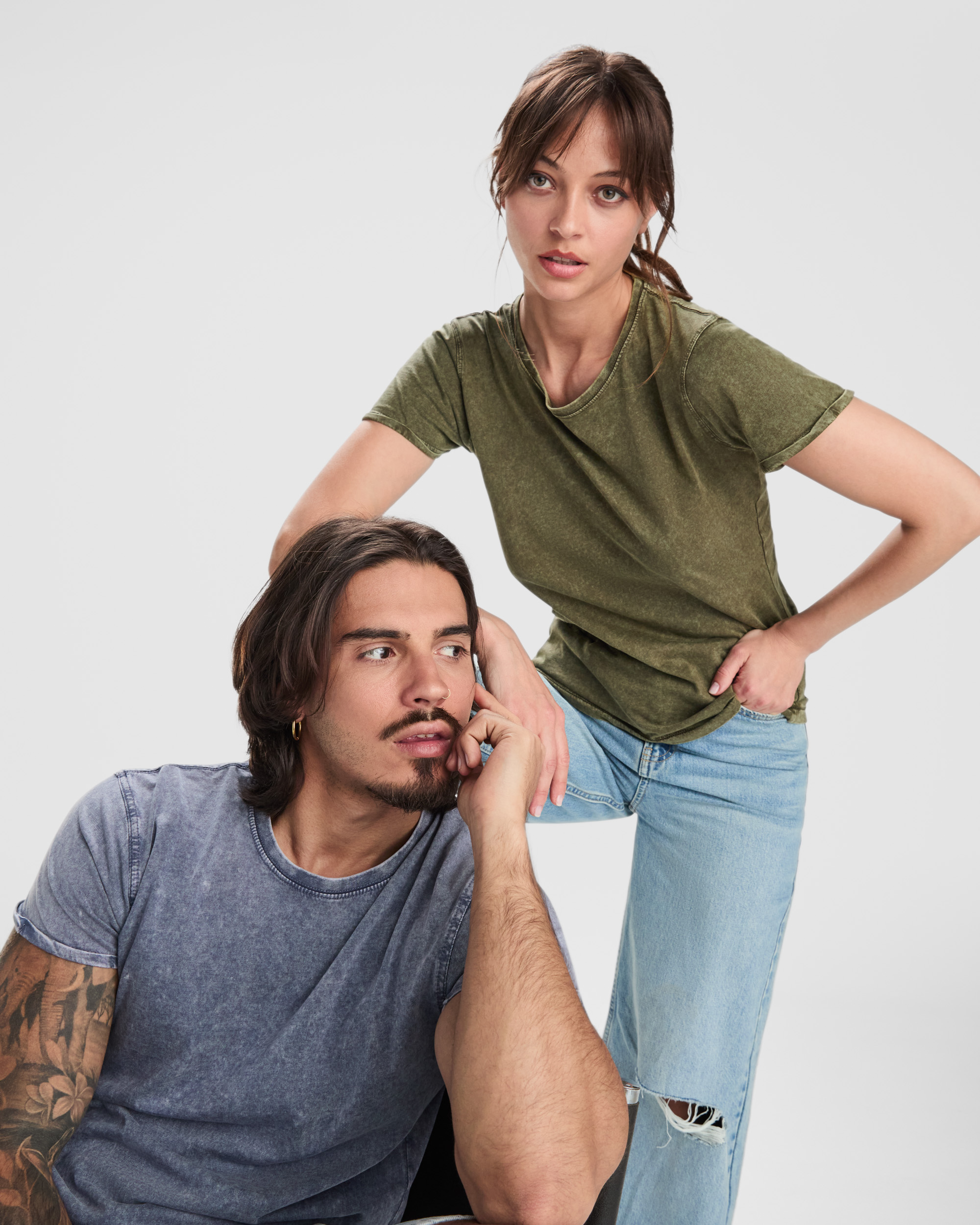 Camiseta de manga corta ligeramente entallada en cintura efecto lavado. Algodón peinado. Cuello redondo en canalé 1×1. Cubrecosturas en cuello del mismo tejido. Costuras dobles en laterales y sisas. Costuras decorativas en mangas y bajo y detalle de costuras de refuerzo en dobladillos.