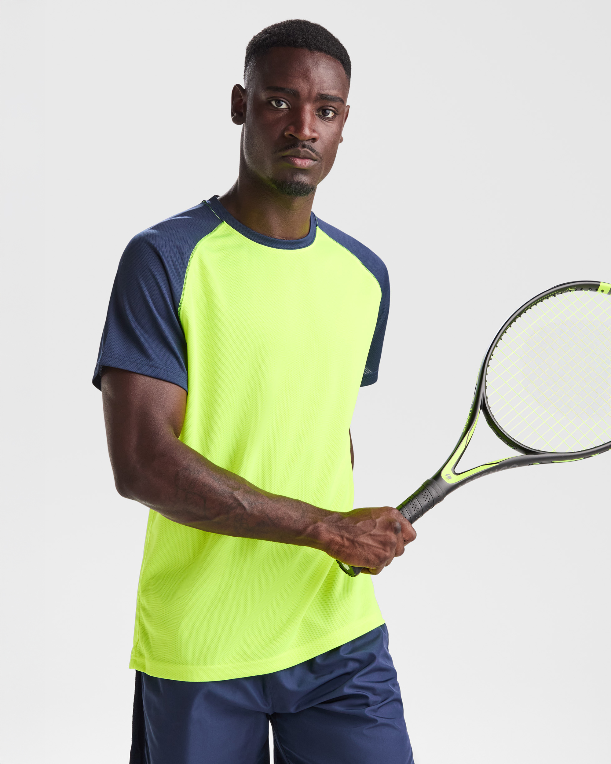Camiseta técnica manga ranglán unisex transpirable bicolor. Combinación de color. Cuello redondo y cubrecosturas del tejido de las mangas.