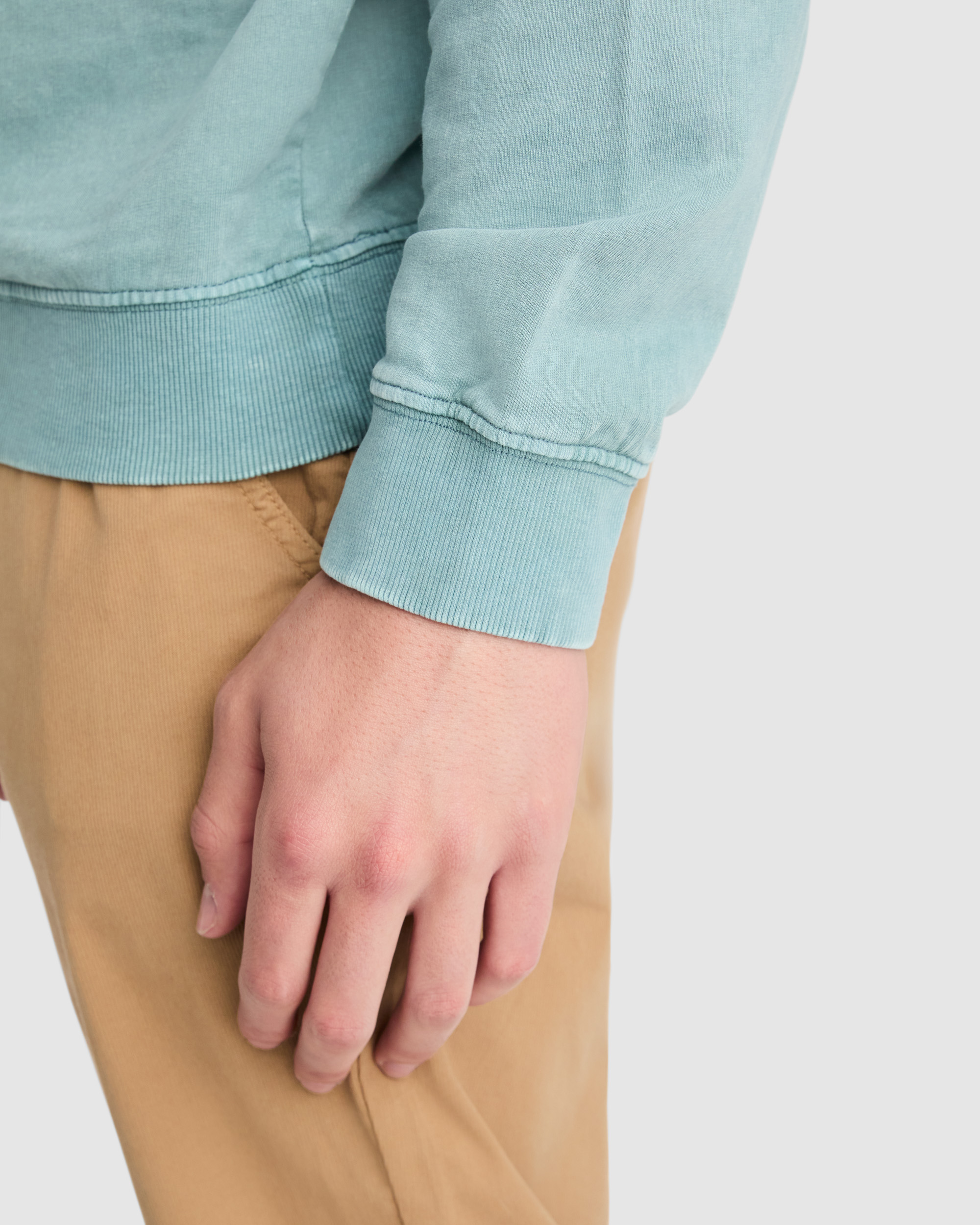 Sudadera unisex de algodón efecto lavado no perchado, cuello redondo. Cuello, puños y cinturilla en canalé 2×1 con elastano. Cubrecosturas del mismo tejido.