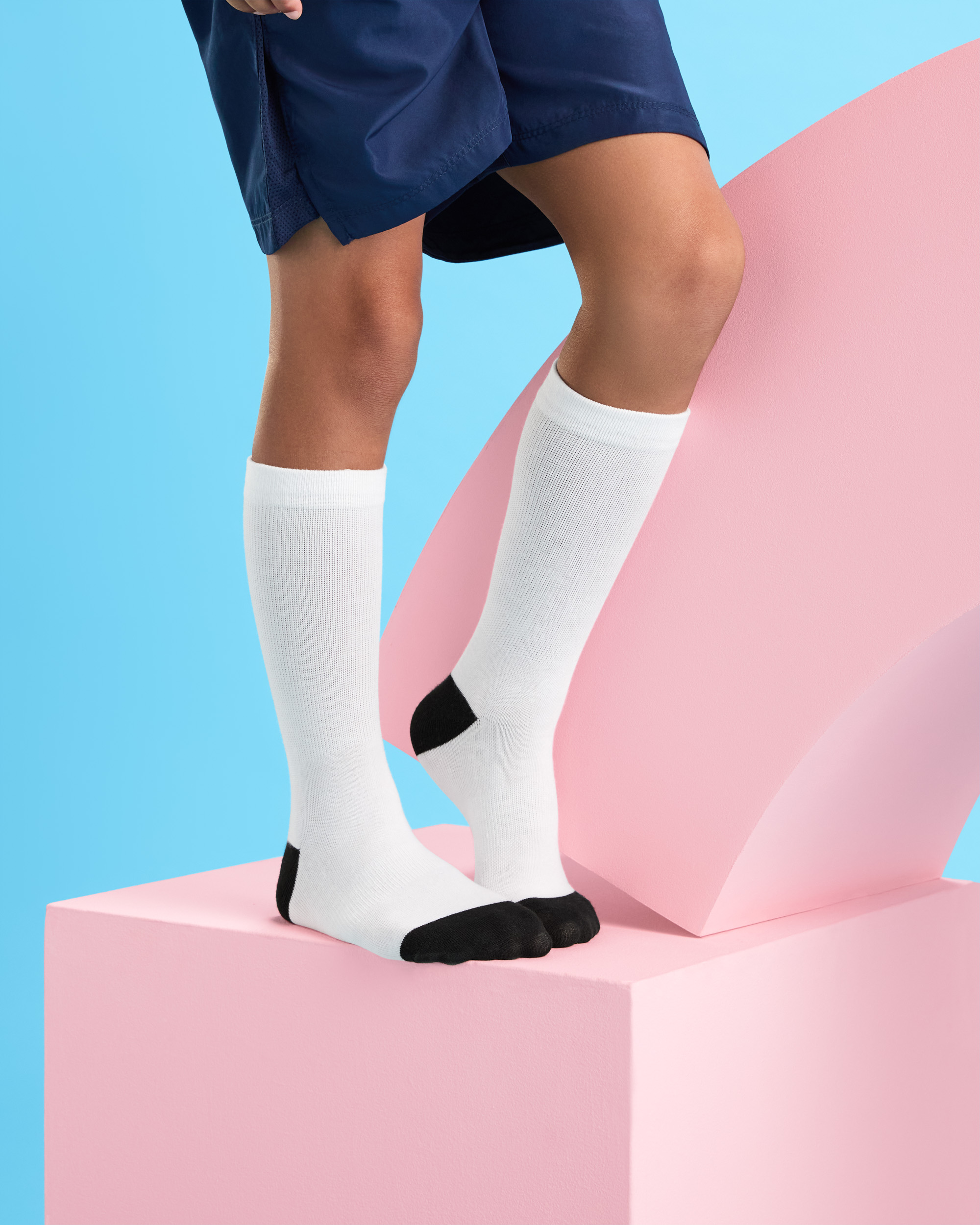 Calcetines blancos para sublimación. Altura media pierna y con canalé elástico. Puntera y talón negros a contraste.