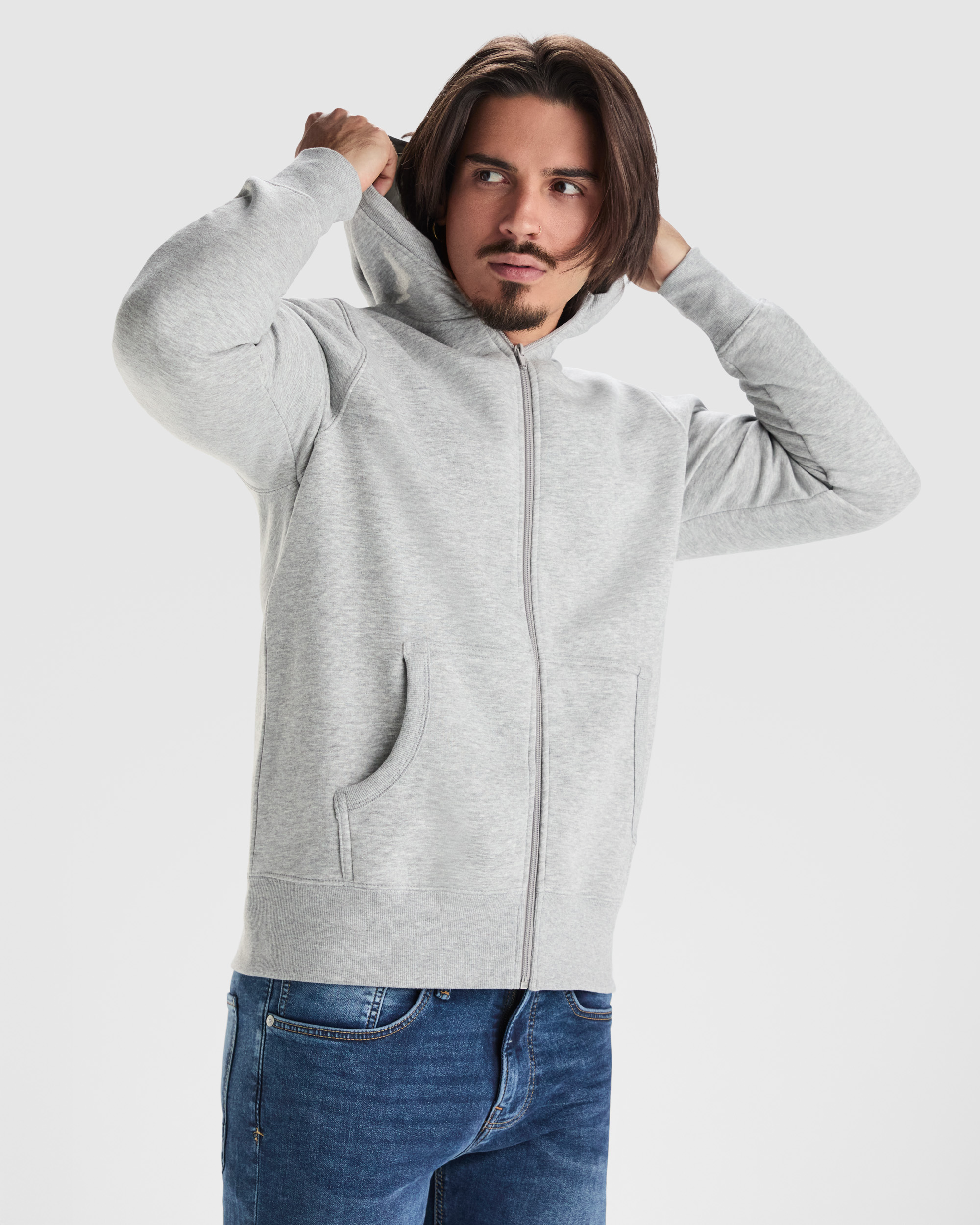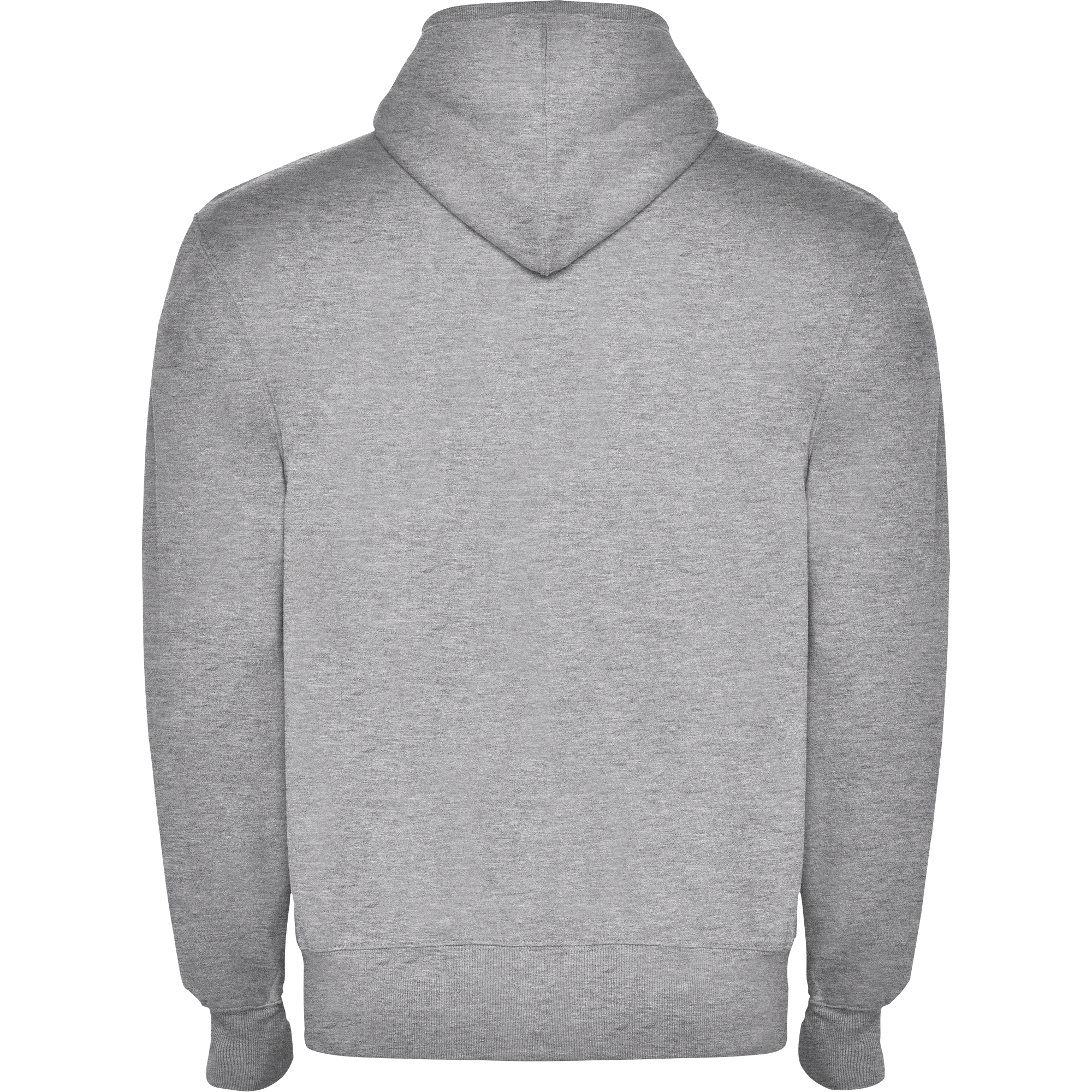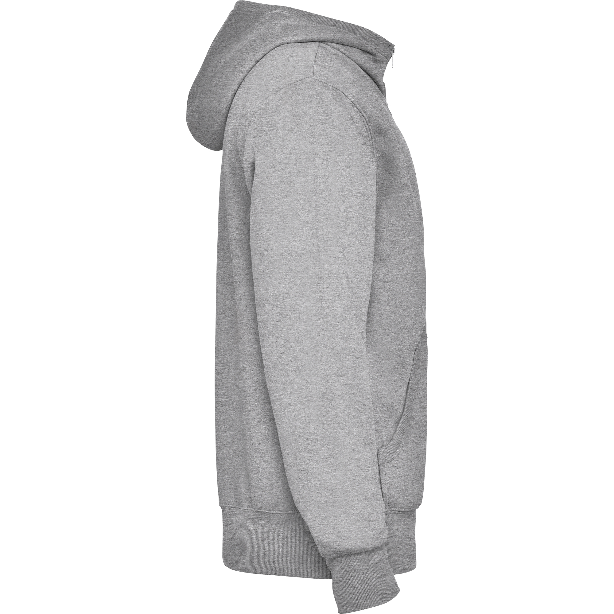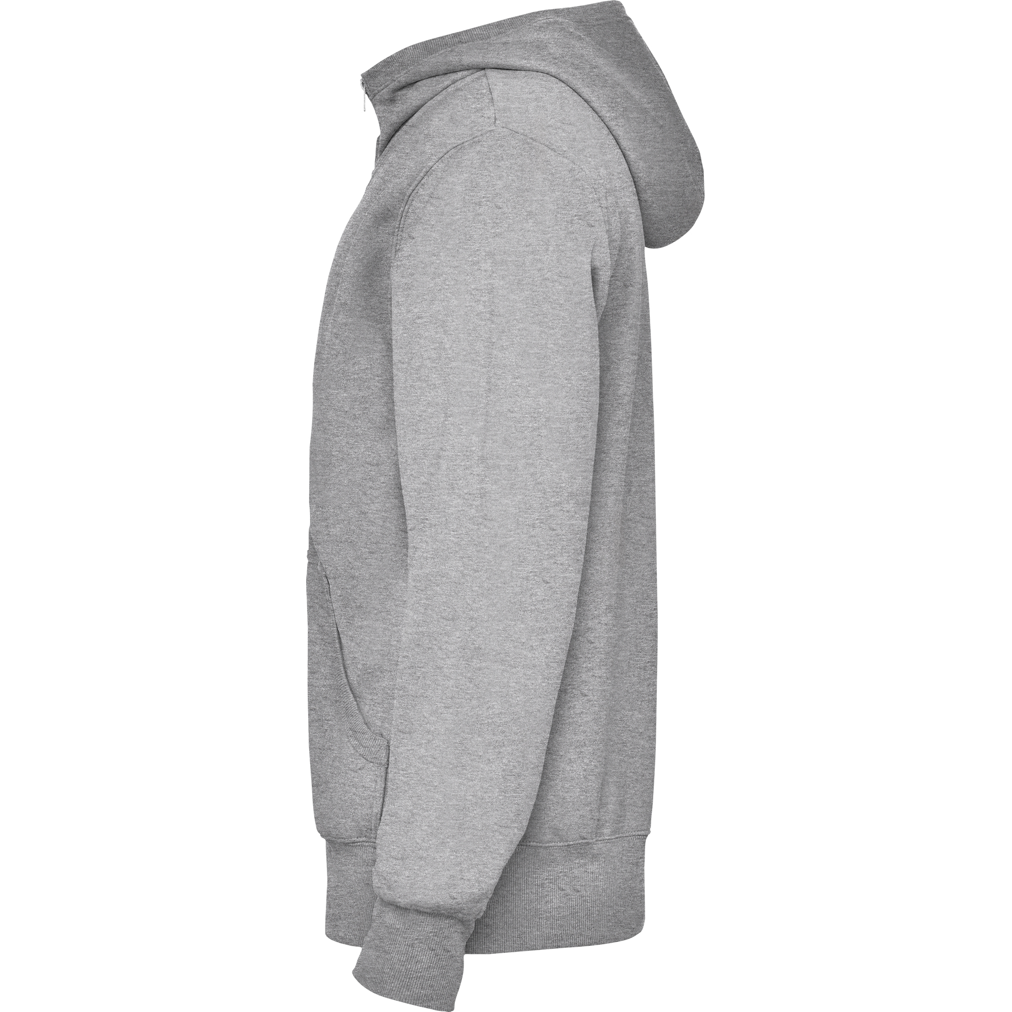 Sudadera unisex con cremallera frontal y capucha. Cremallera al tono. Bolsillos canguro, contorno capucha, puños y cinturilla en canalé 2×1 con elastano. Cubrecosturas del mismo tejido.