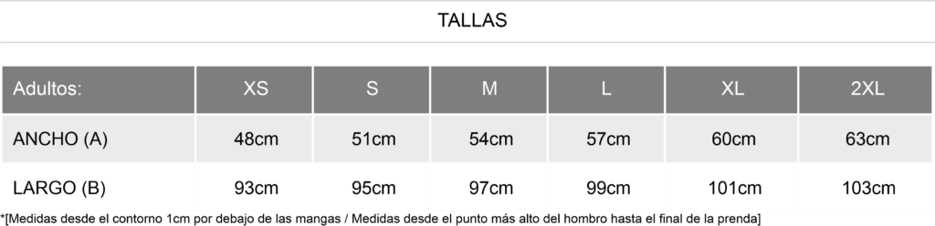 | Talla | XS, S, M, L, XL, 2XL |