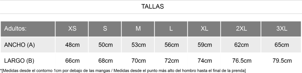 | Talla | XS, S, M, L, XL, 2XL, 3XL |